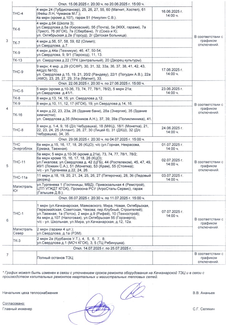 ГРАФИКЕ ОТКЛЮЧЕНИЯ ГОРЯЧЕГО ВОДОСНАБЖЕНИЯ в межотопительный период в связи с проведением промывок и гидравлических испытаний квартальных тепловых сетей на прочность и плотность в рамках подготовки к отопительному сезону 2025-2026гг.